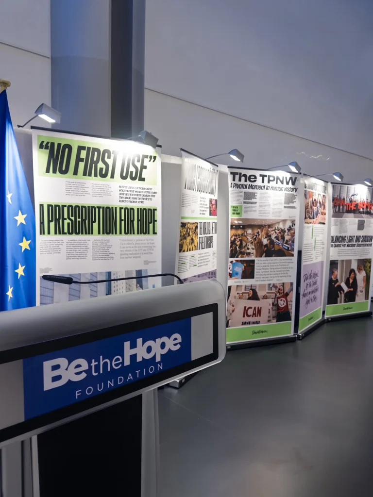La mostra “Senzatomica. Trasformare lo spirito umano per un mondo libero da armi nucleari”, in occasione della sua centesima tappa, approda al Parlamento Europeo a Strasburgo. Il 25 novembre, durante i giorni della seduta plenaria, l’esposizione è stata inaugurata da Roberta Metsola, presidente del Parlamento Europeo. Sono inoltre intervenuti Pina Picierno, vicepresidente Parlamento Europeo, Ignazio Marino, vicepresidente Green/Efa e di Roberto Francini, presidente della Fondazione Be the Hope.